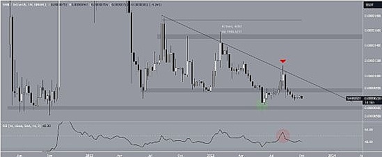 ShibaInu每周时间框架分析显示,自 8 月份被长期下降阻力趋势线拒绝(红色图标)以来,SHIB价格一直在下跌。