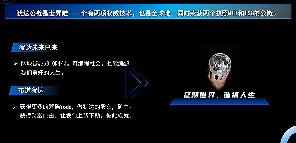 布道犹达未来,投资者将会在此获得更多的judecoin犹达筹码,迅速入局成为犹达的节点矿主、股东,获得数字资产翻转以及财富的自由。犹达未来已来,区块链web3.0时代可编程社会、可编程人生,上帮下助彼此成就,凝聚力量造福社会。