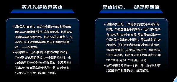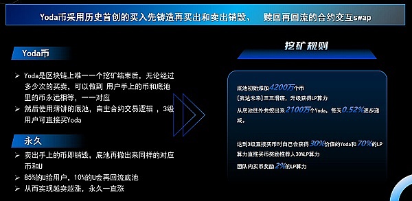 Yoda犹达未来是judecoin犹达共识者与信仰者及各精英人士发起的上帮下助,彼此成就为理念的DAO组织,作为第一个升级挖矿结合只涨不跌Yoda,倡导践行Web.3.0的价值理念,打破币圈卖就下跌的难题,独创买入先铸币再买出,卖出就销毁,赎回手续费回流的SWAP,底池每天固定销毁,从而实现了买也涨卖也涨不买不卖还涨的创新机制。完全解决币圈挖提卖的恶性循环,开创了历史先河,引领新一轮财富。让无数人在区块链行业找到一个创富逆袭的机会。