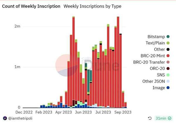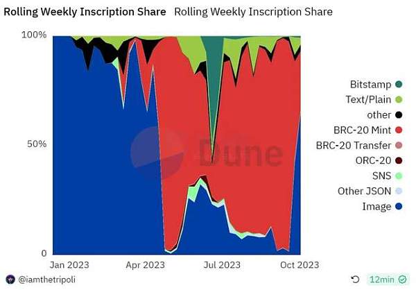 但是最有意思的事情其实是,9 月 25 日 - 10 月 2 日 这一周的时间里,铸造图片类铭文所消耗的费用终于再次占到了当周所有铭文铸造费用的 50% 以上,达到 65.2%,这是自 4 月底以来图片类铭文对 BRC-20 铸币类铭文的首次逆袭。