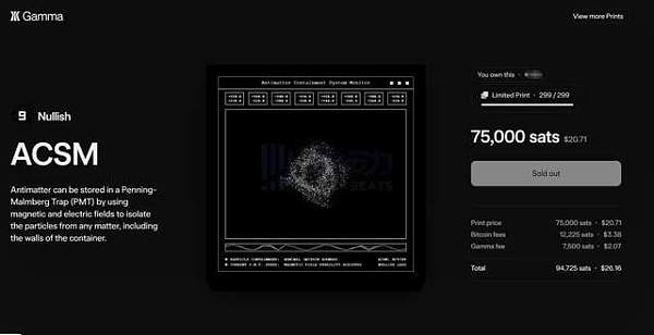我使用「Prints」功能买了两幅作品,其中一幅是比特币 NFT 圈最有影响力的艺术家之一 Nullish 的 ACSM。这幅作品的原版刻在了稀有聪上并且以 0.48 BTC 的价格成功售出,然后用递归铭文创建了另外 299 个版本通过 Gamma.io 的「Prints」功能以 75,000 聪(约 20 美元)的价格发售,1 分多钟就全部售罄。
