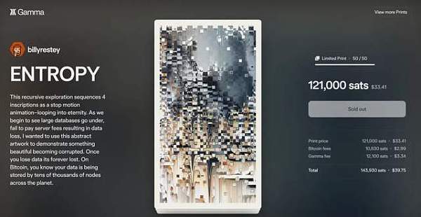 另一位在比特币 NFT 圈十分具有影响力的艺术家 @billyrestey 紧随其后,也在 Gamma.io 上发行了总供应量 50 份的「ENTROPY」,每份售价 121,000 聪(约 30 美元),最终同样成功售罄。