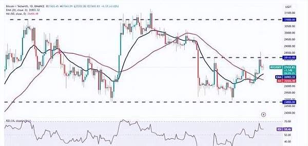 向上的 20 天指数移动平均线和 RSI 表明价格可能再次上涨至 28,143 美元。收盘价高于该水平将激活双底形态,目标价为 31,486 美元。