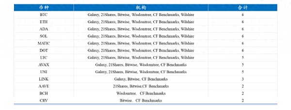 那么就当前市场上的虚拟资产指数而言,哪些虚拟资产有被允许向散户提供交易的可能?根据整理市场数据,目前提供虚拟资产指数并受市场认可的机构主要有 Galaxy,21Shares,CF Benchmarks,Bitwise,Wisdomtree 和 Wilshire 六家机构。