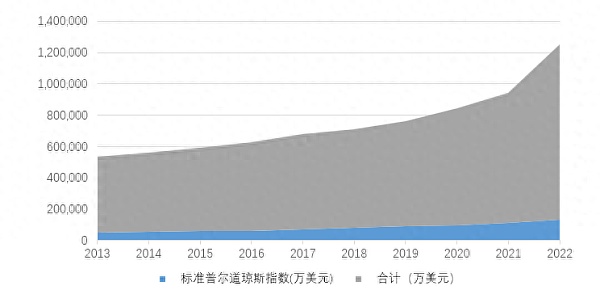 其次,指数业务的收入增量多。在过去十年里,标准普尔的指数业务收入从 2013 年的 4.9 亿美元增长至 2022 年的 13.4 亿美元,增量不可谓不多。其主要原因在于过去十多年间,全球指数基金和 ETF 规模已经从 2008 年的一万亿美元增长至 2022 年底的十万亿美元左右,与之相伴的是指数挂钩费的增长。