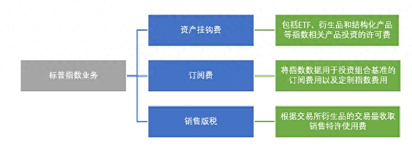 以美国标准普尔公司为例,目前该公司的指数业务(标准普尔道琼斯指数)大约占其总收入的 11%,而指数收入具体有三大来源:资产挂钩费,订阅费,销售版税。