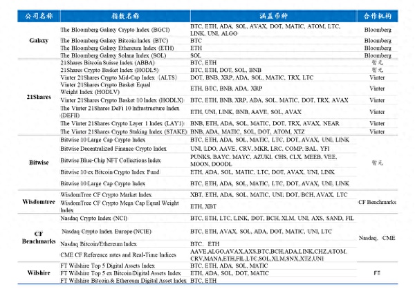 一是在编制虚拟资产指数的基础上发行资管产品。典型的代表如 Galaxy 与彭博就指数合作后发行了 Galaxy Crypto Index Funds;同样的 12 Shares 发行了大量的虚拟资产 ETP。目前绝大多数有指数业务的公司均如此。