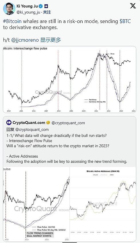 根据 Ki Young Ju 在微博平台 X(以前称为 Twitter)上与他的超过 30 万粉丝分享的帖子,比特币鲸鱼仍在冒险将他们的硬币发送到衍生品交易平台。