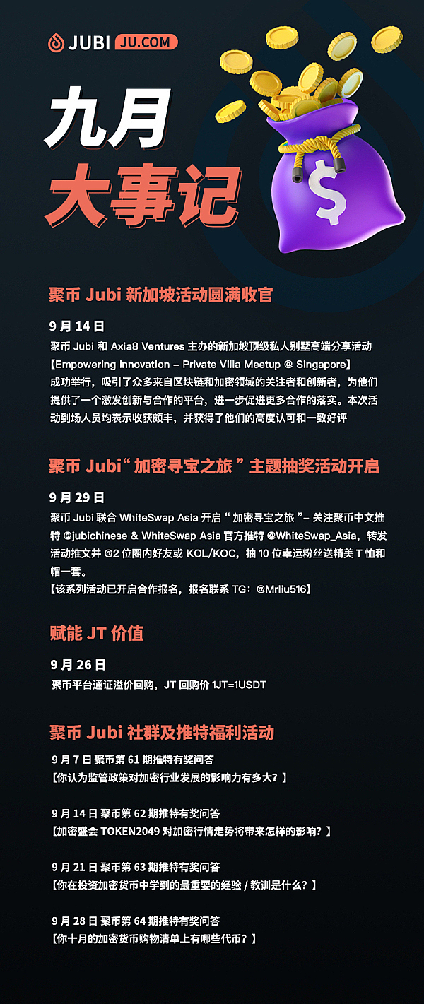 聚币Jubi 9月大事记|上线8重推特抽奖活动 正开启活动合作报名