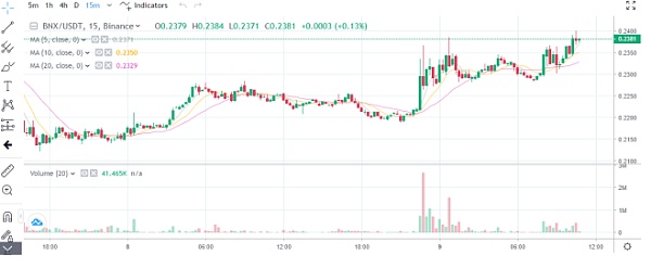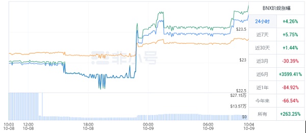 撰写本文时BNX的实时价格为每美元 23.90 刀(BNX / 刀),总市值为 11.01亿 刀。24小时交易量为2499.23 刀。往后随着加密货币市场整体表现良好,参与者的蠢蠢欲动,BNX将会有持续攀升了可能。