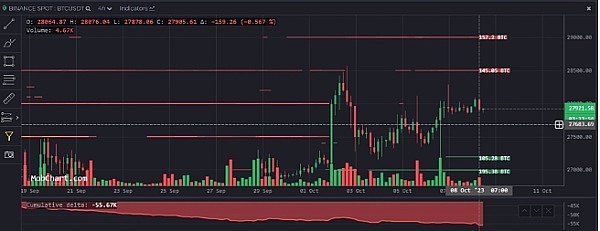 BTC已经呈现出重新测试价格失衡或流动性领域的趋势。自 10 月 2 日以来,买家利用 $27.0k – $27.2k(橙色)的价格失衡重新进入市场。