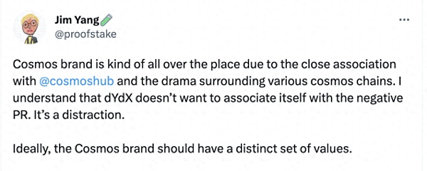 由于与 Cosmoshub 的密切联系,以及围绕各种 Cosmos 生态的 drama 事件,Cosmos 品牌有点遍地开花。我理解 dYdX 不想把自己与负面的公关联系起来。