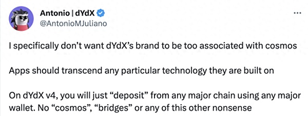 我特别不希望 dYdX 的品牌与 cosmos 有太多联系,应用程序应该超越它们所建立的任何特定技术。