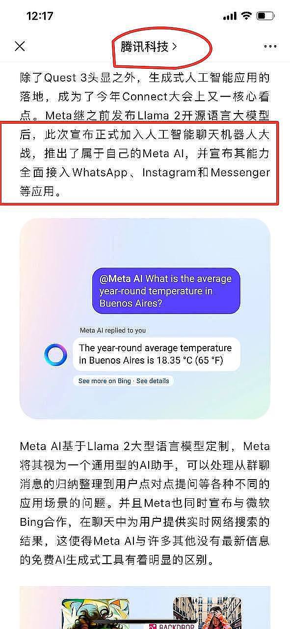 近期Meta Connect科技大会上,Meta CEO马克·扎克伯格表示,Meta AI由该公司的大型语言模型Llama 2提供支持,并且是与微软必应合作打造的。
