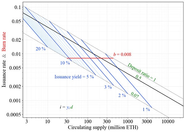 由于根据当前奖励曲线,发行量 i 可以表示为 i=cF√d/√S,它会随着流通供给的变化而变化(抵押率 d 提供了一定的调节空间)。图示展示了以太坊的发行率对角线和自合并以来的平均 b。