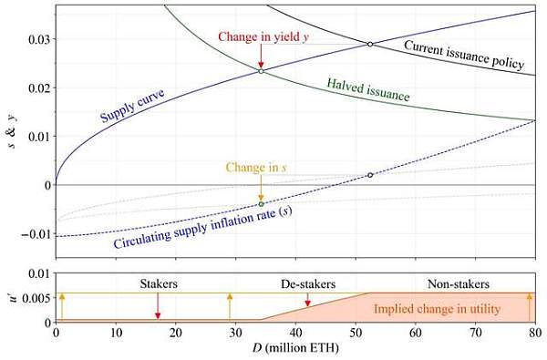 维持这种稳固安全的「回报率」大约是 r=Y/S=0.4%,这个数字低得惊人。我们充分利用这一点,最大限度地为用户提供效用。与当前发行政策的潜在平衡由黑色圆圈表示。