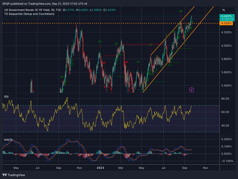 10年期国债收益率飙升至16年新高,而衡量美元兑一篮子主要货币强弱的DXY指数一度跃升至106附近,为3月份美国地区银行业困境达到顶峰以来的最高水平 。