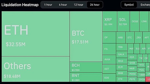 ETH 因为价格下跌导致过去 24 小时内清算了 3278 万美元的多头头寸。最大的单笔清算订单是加密货币交易所 Binance 上 450 万美元的 ETH-BUSD 多头。