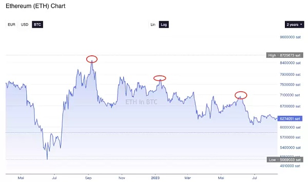 例如,在 DeFi 牛市高峰,以及 ETH Merge 等较大利好出现时,ETH/BTC 的汇率出现了大幅上涨。