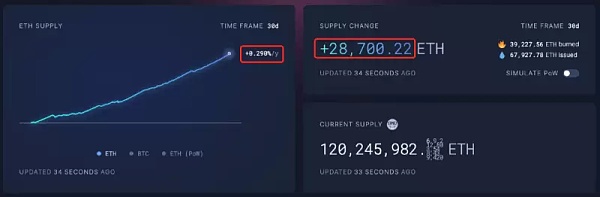 2、链上交易活动大幅减少,gas 费用降低,也使得最近 30天内,ETH 代币的供应量大于 ETH 的燃烧量,ETH 代币也从通缩重新恢复到了通胀状态,最近30天的年化通胀率达到了 0.29%,最近30天新增了2.8万枚ETH。