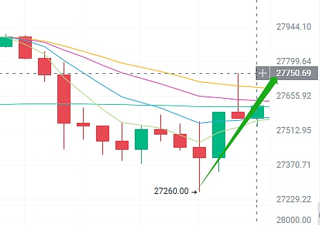 4小时级别趋势当前已经破坏了,除非短期再拉回27800上方,否则还会持续盘整向下验证支撑,下方支撑位27100、26600附近。