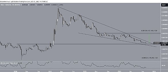 楔形的支撑线也与 0.00095 美元的水平支撑区域重合,增加了其重要性。