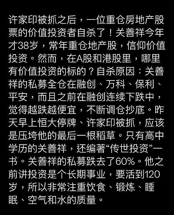 近期传闻私募基金价值投资者,由于常年重仓A股地产股,随着许家印被抓成了他的最后一根稻草,最后造成了令人唏嘘的结局。这位年轻的投资者自称“中国巴菲特”,随着股价连续下跌,不断加仓抄底。最后酿成悲剧。