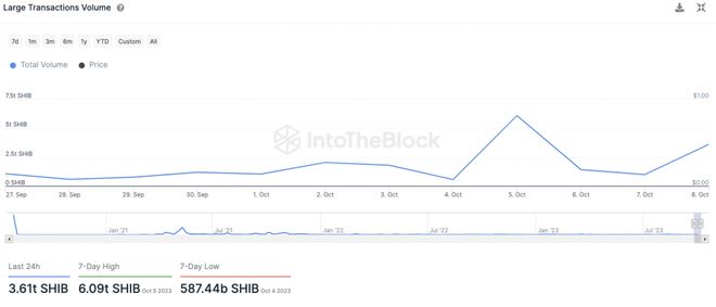 根据 IntoTheBlock 的数据,柴犬 (SHIB) 的大额交易激增 353%,价值超过 10 万美元。这些交易已导致近 2.59 万亿代币的交换。激增还导致每日交易量增加,达到 3.61 万亿个代币,即 2602 万美元。
