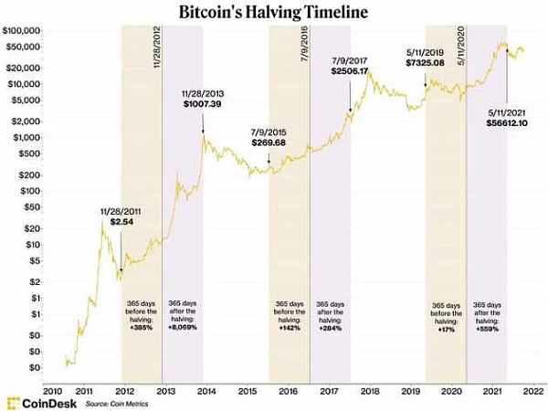 由此而来的结果是,比特币的每日新供应量急剧减少,这增加了其稀缺性,并提高了其价值。这一事件确实是加密领域的一件大事,但并不是所有人都同意它会对整个加密和金融行业产生多大影响。2012 年、2016 年和 2020 年的每一次减半都对随后几年的市场产生了巨大影响(见下图),帮助推动比特币价格呈指数级上涨。