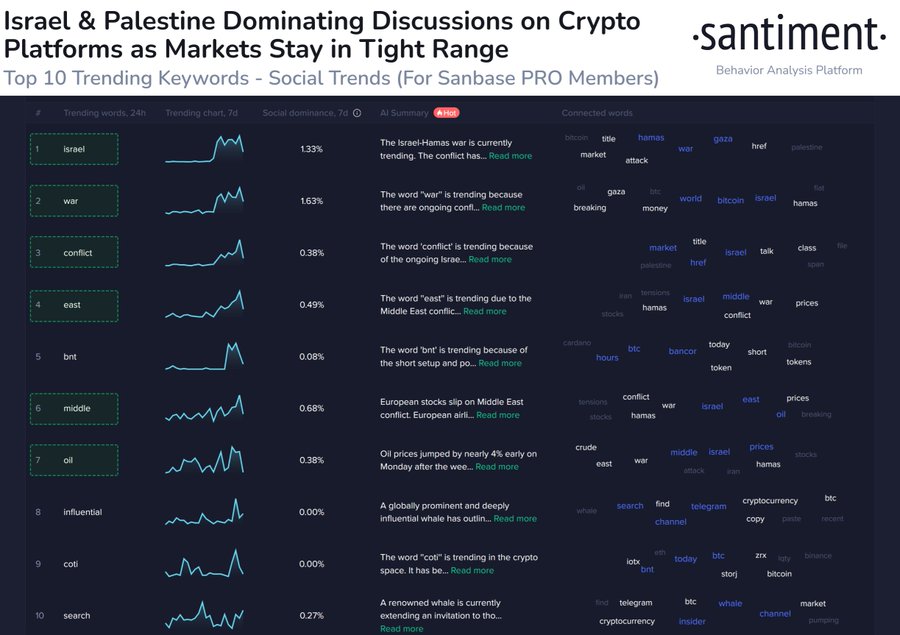 与此同时,根据区块链和行为分析平台 Santiment 10 月 9 日分享的调查结果,加密货币领域的讨论已经(不出意外)从常规价格讨论转向以色列和巴勒斯坦。