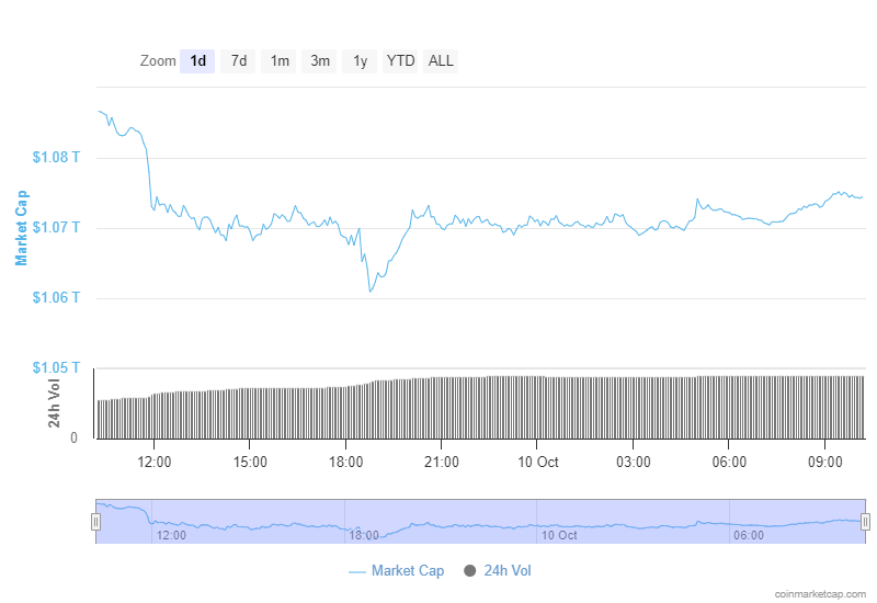 具体来说,截至发稿时,加密货币行业总市值为 10.74 亿美元,过去 24 小时内总市值下跌 1.56%,这也代表过去 7 天下跌 1.47%,较 10 月 3 日的约 10.9 亿美元下降根据从加密监控平台CoinMarketCap获得的最新信息。