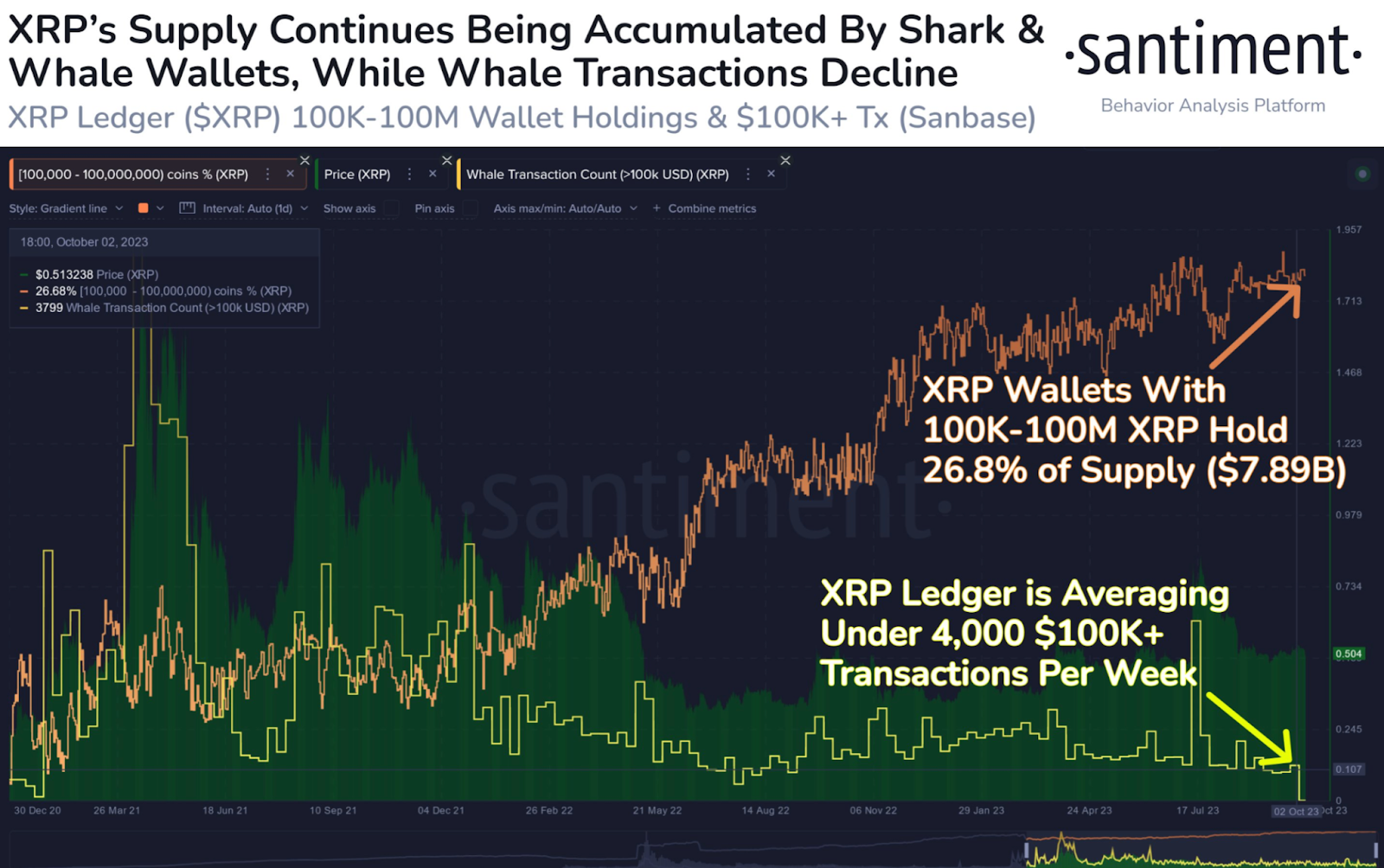 现在,许多鲸鱼正在从以太坊转向 XRP,积累率也飙升。根据Santiment的数据,拥有 10 万至 1 亿 XRP 的钱包持有近 78.9 亿美元的代币,而一年前为 71.6 亿美元。