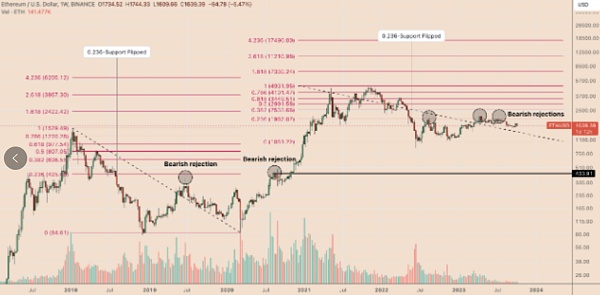 2018-2019 年,0.236 Fib 线就在 425 $附近,感觉就像以太坊在爬楼梯,然后又滑了下来。2023 年,该线将接近 2000 $,似乎又像是过山车要开始下坡了。