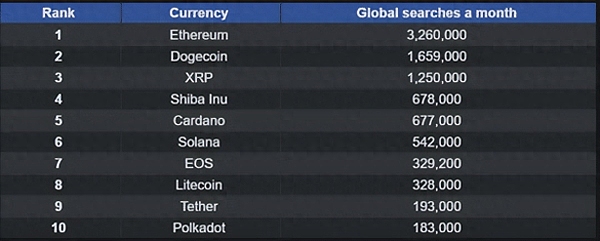 该研究试图在流行的搜索引擎谷歌上找到搜索最广泛的加密货币,同时排除最著名的加密资产比特币。毫不奇怪,以太坊排名第二受欢迎的比特币替代品,每月有 3,260,000 次搜索。