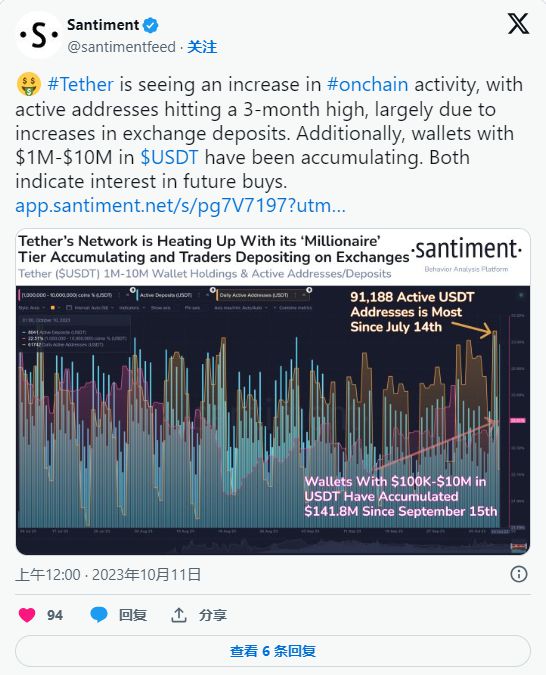 与此同时,领先的区块链分析公司 Santiment 报告称,与最大的稳定币 Tether (USDT) 相关的活跃地址激增。这也导致主要在 100 万美元至 1000 万美元 USDT 钱包之间的兑换存款增加。
