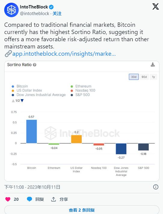 另一个区块链数据分析平台IntoTheBlock透露,“与传统金融市场相比,比特币目前拥有最高的索蒂诺比率”。换句话说,与其他主流资产相比,比特币以“更有利的风险调整回报”而脱颖而出。