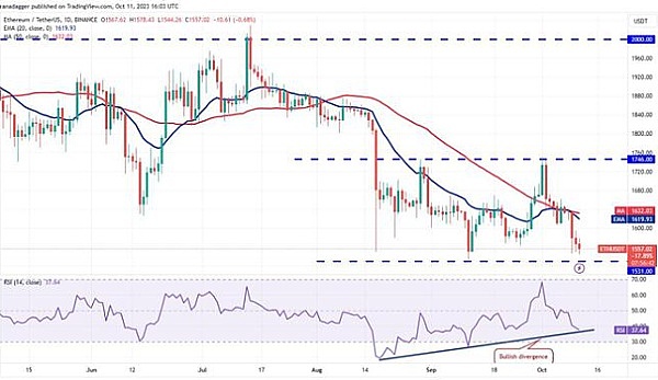 过去两天,以太坊在 1,531 美元的支撑位附近找到了买家,这可能是一个积极的信号。这表明价格可能会继续在 1,531 美元至 1,746 美元之间波动一段时间。ETH/USDT 货币对的正背离可能表明 1,531 美元附近的抛售压力有所下降。这可能会引发向 20 日均线 1,619 美元的缓解反弹。如果 ETH 的价格从该水平下跌,空头可能会再次尝试将该货币对推低至 1,531 美元以下,并开始下跌至 1,368 美元。