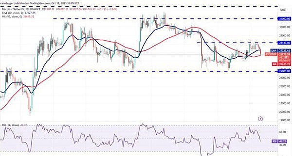 比特币在 10 月 11 日跌破 20 天指数移动平均线 27,227 美元后找到支撑。这可能表明空头正试图获得控制权。下一个值得关注的支撑位是 50 日简单移动平均线 26,615 美元。跌破该水平可能表明投资者急于退出。BTC/ USDT 货币对可能会跌至 26,000 美元,并最终重新测试 24,800 美元的支撑位。