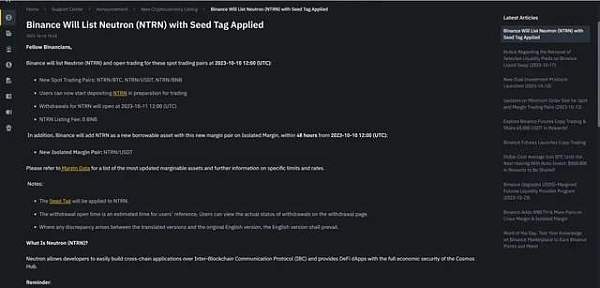 币安将上线带有种子标签的 Neutron (NTRN)
