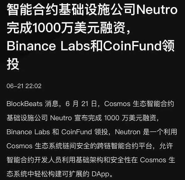 6月21日,智能合约基础设施公司Neutro宣布完成价值1000万美元的融资。本次融资由Binance Labs和CoinFund领投,标志着该公司在区块链领域的前景看好近期融资将有助于Neutro进一步扩展其智能合约生态系统,提供更多创新的区块链解决方案,并加速其在这一竞争激烈的市场中的发展。