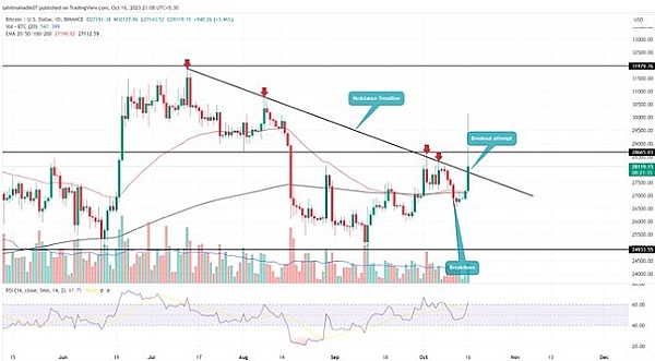 随着 SEC 批准iShares 现货比特币 ETF的消息传出,比特币价格飙升,突破长期阻力趋势线,从 27,143 美元上涨至 30,127 美元。这一阻力位是过去三个月上涨趋势的重大障碍,帮助买家对价格施加压力。