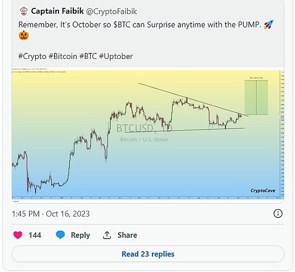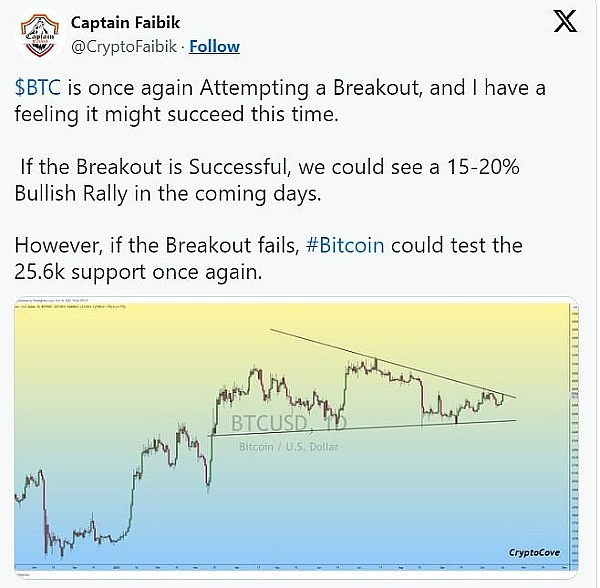 加密货币分析师表示,在多次尝试失败后,BTC 再次试图突破上升三角形形态。该分析师进一步表示,如果 BTC 突破,价格可能会上涨 15-20%。然而,如果这是又一次拒绝,那么 BTC 的支撑位将是 25,600 美元。