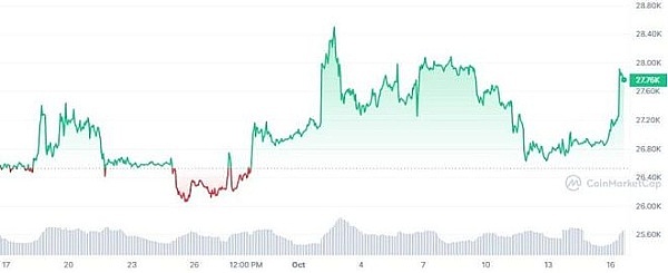 BTC 在 10 月 2 日创下最高价 28,494 美元,在 9 月 25 日创下最低价 26,064 美元。在本月上涨 4.4% 后,目前 BTC 交易价格为 27,725 美元。