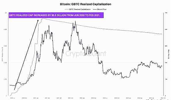 将这种情况与上一个牛市周期期间全球最大的比特币基金灰度比特币信托(GBTC)进行比较是很有趣的。当 BTC 飙升时,GBTC 的已实现上限仅增加了 55 亿美元,远低于预期通过现货 ETF 注入的 1550 亿美元资本。