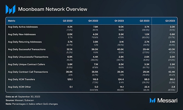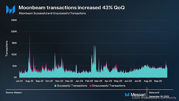 从关键数据看,Moonbeam网络质押量每月以约20%左右的幅度增长,加上Moonbeam网络目前有超过70个收集人(collator),总体质押量的增加对网络整体的稳定运行和去中心化将产生正向影响。此外,尽管第三季度的每日活跃地址数出现小幅下降,但每日成功交易笔数在第三季度呈现增长,这主要是源于近期Moonbeam Ignite活动和Upbit上线。