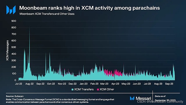 从XCM方面来看,Moonbeam在平行链中的活跃度靠前。Moonbeam-Acala通道是最常用的XCM通道。本季度Moonbeam推出了与Centrifuge、Nodle和Origin Trail的新XCM集成。