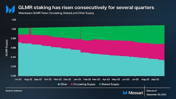 GLMR是Moonbeam网络的原生token,具有多种功能,如奖励收集人、实现链上治理,以及支付网络交易费。GLMR的年通胀为5%,无供应上限。Moonbeam产生的交易费中有80%会被销毁,剩下20%进入财政库。GLMR质押的比例在几个季度中持续上升,到第三季度末,质押的比例达到顶峰,占总供应量的36%。在这个季度Moonbeam引入了投票委托功能。