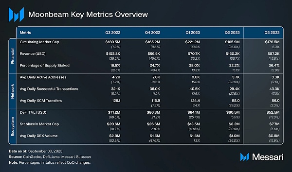 2023年第三季度,Moonbeam在该季季度最后一周市值显着飙升,在不可预测的加密市场中表现出了韧性。本季度Moonbeam的业绩有喜有忧:虽然收益和TVL等指标环比下降,但交易和质押供应百分比等其他指标却出现增长。尽管XCM消息总数略有下降,但Moonbeam仍然保持着这一重要类别中领先平行链的地位。