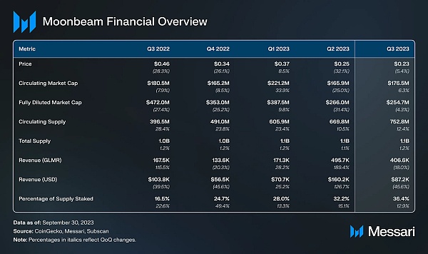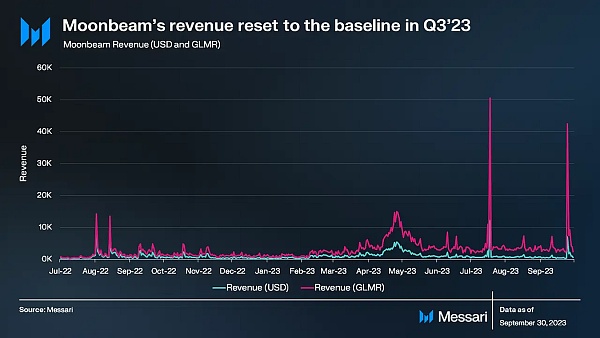 在第二季度,由于Runtime 2302和Xen Crypto部署,Moonbeam收益激增。然而,第三季度收益从16万美元降至8.7万美元,环比下降46%。这使得Moonbeam第三季度与历史平均水平保持一致。