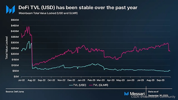 去年,Moonbeam的美元TVL保持相对稳定,但GLMR的TVL持续上升。截至本季度末,Moonbeam的TVL为5,300万美元,在公链中排名约30位。